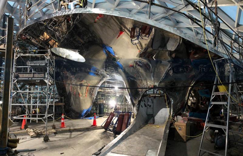 The Discovery Slides playground spans over 21 meters by 15 meters in length and stands at 7.0 meters high at the highest point of the platform made by 316L stainless steel material, its thickness is even reach 6mm which increased the fabrication difficulty much more. The whole piece is completed by hand forging, it is indeed a very complex and unique functional sculpture. From concept design to realization, took more than two year complete.